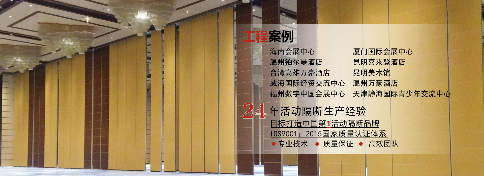 135 3317 7889 何經理/189 8866 7889李經理廣東一固隔斷制品有限公司成立于1998年,國家高新技術企業(yè),位于中國佛山市南海區(qū)里水鎮(zhèn),是一家專業(yè)從事活動隔斷和辦公室玻璃隔斷系統(tǒng)開發(fā),銷售,生產和售后服務的一站式生產廠商。公司產品廣泛應用于星級飯店,寫字樓,餐廳,宴會廳,會議中心或會展中心等商業(yè)場合,提供便捷有效的空間管理解決方案。最高門板高度可達20米,最大隔音系數可達56分貝。 一固公司擁有兩個現(xiàn)代化的生產基地,占地超過10,000平方米,...